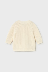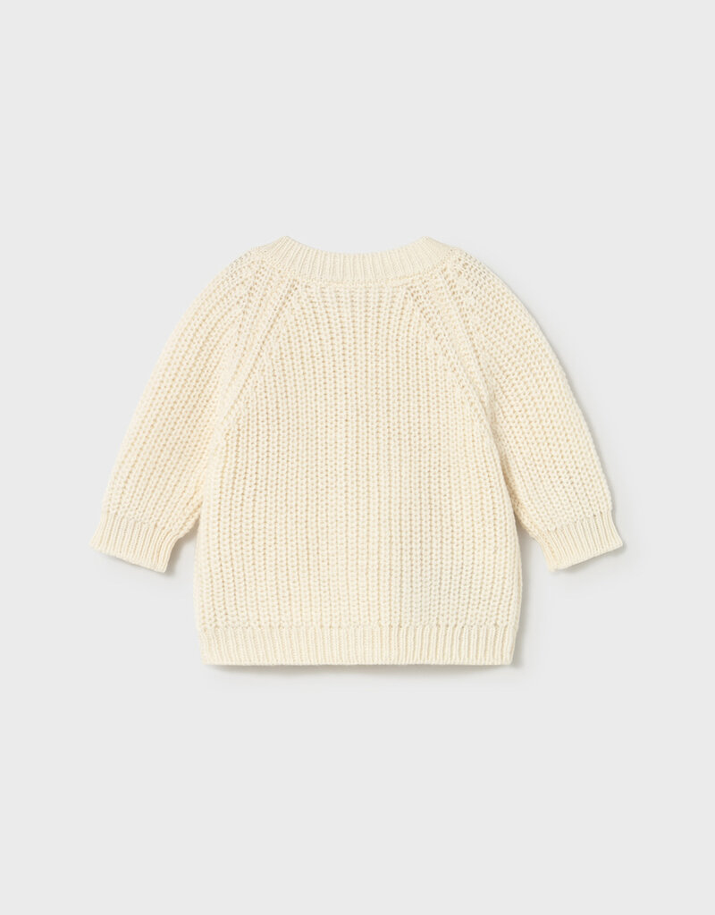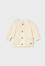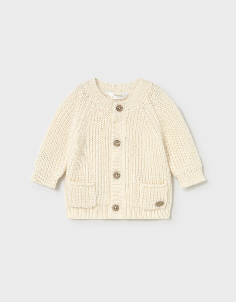 Long sleeved Cardigan for newborn baby boy. Round neckline. Button fastenings down the front. Knitted fabric, soft and pleasant to the touch. Functional front pockets. The item has a unisex design which offers great versatility through its neutral color tones and shape.